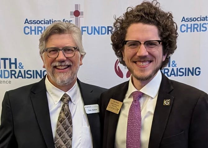 The thing I love the most about this Substack project is the responders! So far, 13 of my favorite writers and fundraisers have shared their wisdom in these posts — it is so fun! I have to say that today’s responder is my favorite fundraiser on the entire planet— Luke Hanson. Luke is Director of Planned and Reunion Giving at Gustavus Adolphus College. And he is my son. Luke has always been sincerely interested in people — it is his superpower in fundraising work. The best thing that happens at fundraising conferences these days is when someone says, “Oh, you’re Luke’s dad!” Yes I am.