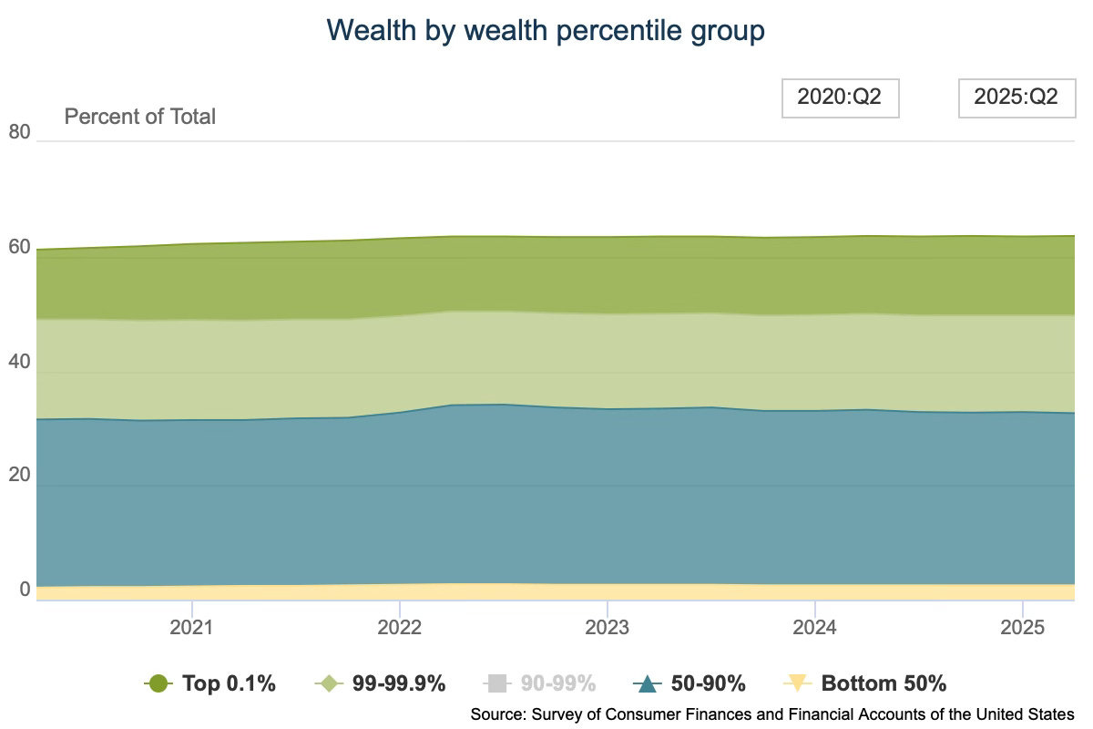 In this country there exists a dramatic wealth disparity, more extreme than most of us can comprehend. In the first two quarters of 2025, the wealthiest 1% of Americans held 29% of total household wealth, while the bottom 90% held 33%, according to the Fed. And the bottom 50%? Their wealth hardly shows on the chart.